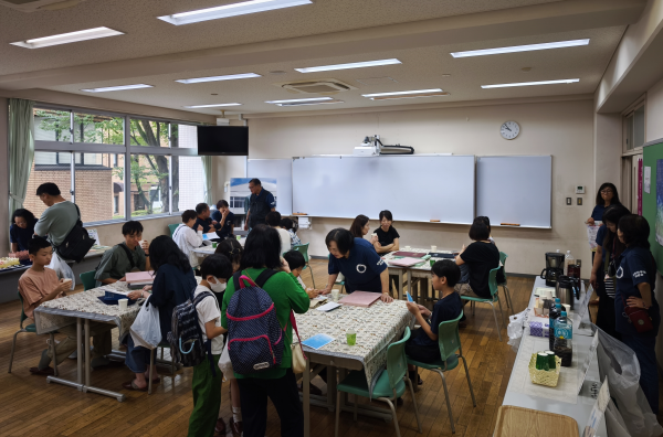 「桜空祭」では、これまで中学校舎(立志舘)1階の入り口付近で桜美林グッズの販売をしていましたが、今回初めて中学校舎2階の教室をお借りし、お茶の無料サービスと桜美林グッズ販売を行いました。また教室の中央にはテーブルと椅子のセットを4か所設置し、中高卒業アルバムをご覧いただきながらの休憩場所としました。