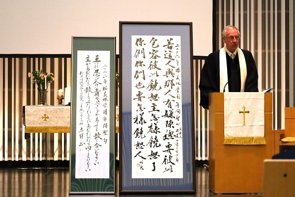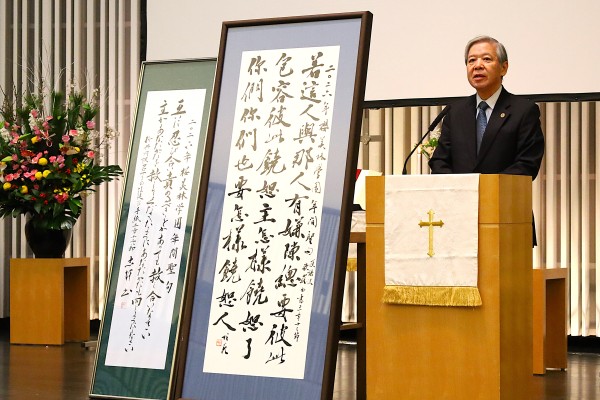 式の中で、司式のMENSENDIEK, Jeffreyチャプレンが、今年の学園の指針となる年間聖句「互いに忍び合い、責めるべきことがあっても、赦し合いなさい。主があなたがたを赦してくださったように、あなたがたも同じようにしなさい。」(新約聖書 コロサイの信徒への手紙 3章13節)を披露しました。