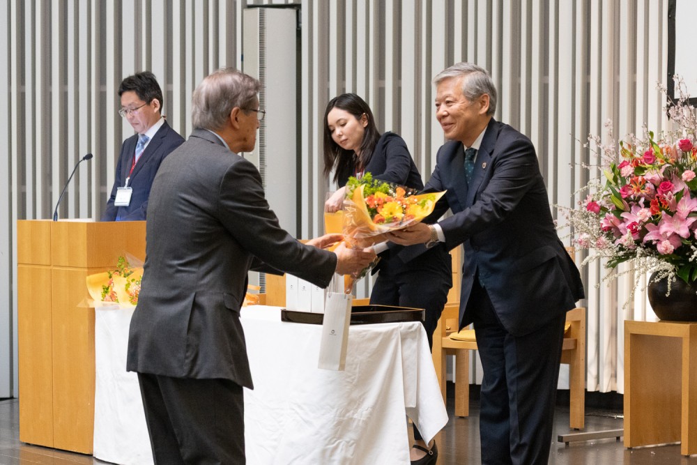 続いて大槻達也理事長による送別の言葉では、1980年代後半の「町田ワンキャンパス・文学部のみ」という時代から、現在では1万2千人を超える学生を抱える「5キャンパス・7学群制」へと発展を遂げた歩みを振り返り、この劇的な発展と教育・研究の充実は、ひとえに退職される皆様の尽力とご苦労の賜物であると深く謝意を表しました。
